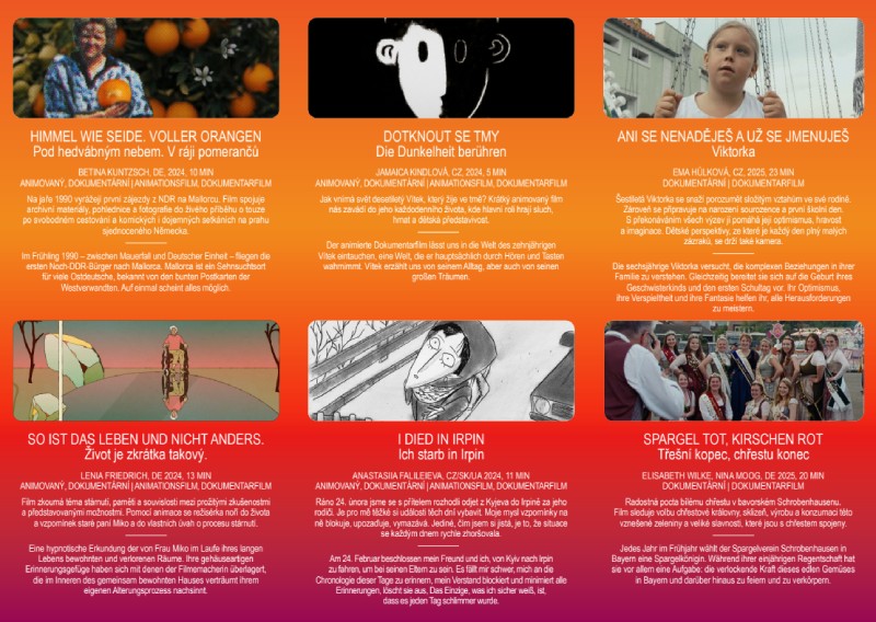 HIMMEL WIE SEIDE. VOLLER ORANGEN von Betina Kuntzsch nimmt die Zuschauer*innen mit auf den ersten Mallorca-Urlaub von DDR-Bürgern im Jahr 1990. Einen ganz anderen Ton schlägt Anastasiia Falileieva an: In ihrem eindringlichen animierten Dokumentarfilm ICH STARB IN IRPIN erzählt sie von ihrer Flucht aus Kyiv zu Beginn des russischen Angriffskrieges. Mit DIE DUNKELHEIT BERÜHREN eröffnet Jamaica Kindlová einen sensiblen Blick in die Welt des zehnjährigen Vítek, der seine Umgebung vor allem durch Hören und Tasten wahrnimmt. Nicht weniger beeindruckend ist die sechsjährige VIKTORKA, die in Ema Hůlkovás gleichnamigem Film den Herausforderungen ihres jungen Lebens begegnet. Lenia Friedrich widmet sich in SO IST DAS LEBEN UND NICHT ANDERS. der Lebensgeschichte von Frau Miko – einer Frau, die viel erlebt hat, deren Erinnerungen jedoch langsam verblassen. Den Abschluss bildet schließlich SPARGEL TOT, KIRSCHEN ROT von Elisabeth Wilke und Nina Moog – eine liebevolle Hommage an das wohl beliebteste Saison-Gemüse der Deutschen.