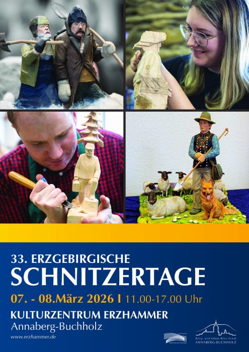 Annaberg-Buchholz, 25. Februar 2026 - Ein Wochenende ganz im Zeichen erzgebirgischer Volkskunst erwartet die Besucher am 7. und 8. März 2026 im Kulturzentrum Erzhammer in Annaberg-Buchholz. Bereits zum 33. Mal werden die Erzgebirgischen Schnitzertage vom Team des Erzhammers organsiert und machen das Haus zur größten offenen Schnitzwerkstatt der Region. An beiden Tagen, jeweils von 11 bis 17 Uhr, können Gäste hautnah miterleben, wie aus Holz Kunstwerke entstehen – geschaffen von erfahrenen Meistern ebenso wie von begabten Anfängern jeden Alters.