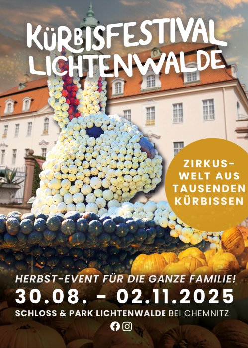 Schloss & Park Lichtenwalde verwandeln sich ab 30. August erneut in eine Kürbis-Erlebniswelt voller Überraschungen. Das diesjährige Motto „Zirkus“ sorgt mit 18 riesigen Kürbisfiguren, einem größeren Rundgang und dem Kürbislabyrinth für zahlreiche neue Highlights. An den Wochenenden erwarten die Besucher zudem abwechslungsreiche Events rund um die orangene Frucht. Der Online-Ticketverkauf ist bereits gestartet.