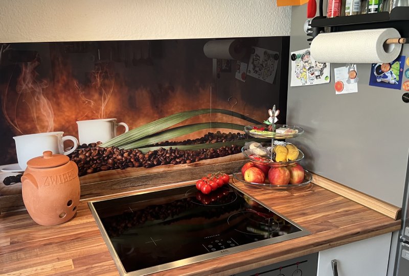 Metallic-Effekte verleihen modernen Küchen eine luxuriöse Ausstrahlung. Naturmotive bringen Frische und Lebendigkeit in den Küchenraum. Die nahtlose Optik wirkt großzügiger als geflieste Alternativen. Auch individuelle Motive wie Landschaftsfotografien, abstrakte Kunstwerke oder geometrische Muster schaffen ein einzigartiges Ambiente.