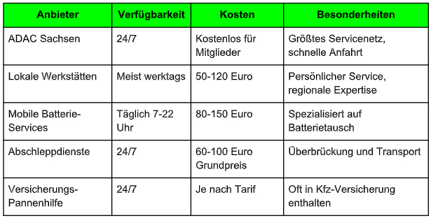 Viele Kfz-Betriebe in Sachsen bieten eigene Pannenhilfe an. Diese Services sind oft günstiger als kommerzielle Anbieter und kennen sich bestens in der Region aus. Mobile Werkstätten bringen das nötige Equipment direkt zum Pannenort und können defekte Batterien sofort austauschen.