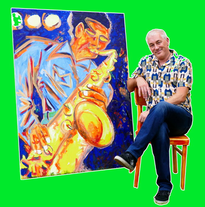 Wichtig ist allein der Ausdruck in dem Moment, wenn der Musiker und sein Instrument im Augenblick einer scheinbar intimen Beziehung verweilen. Die starken, leuchtenden Farben unterstreichen den positiven Einfluss der Musik in unserem Leben.